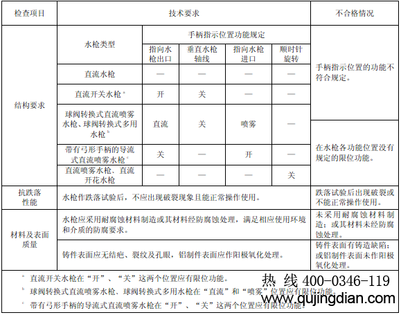 6.11.1.2.1 目測檢查消防水槍各操縱機(jī)構(gòu)動作及限位的情況、指示標(biāo)記、材料及表面質(zhì)量。直流噴霧水槍﹑直流開花水槍,其調(diào)節(jié)噴霧角和開花角的旋轉(zhuǎn)開關(guān)的旋轉(zhuǎn)方向可從水槍的進(jìn)水口觀察。